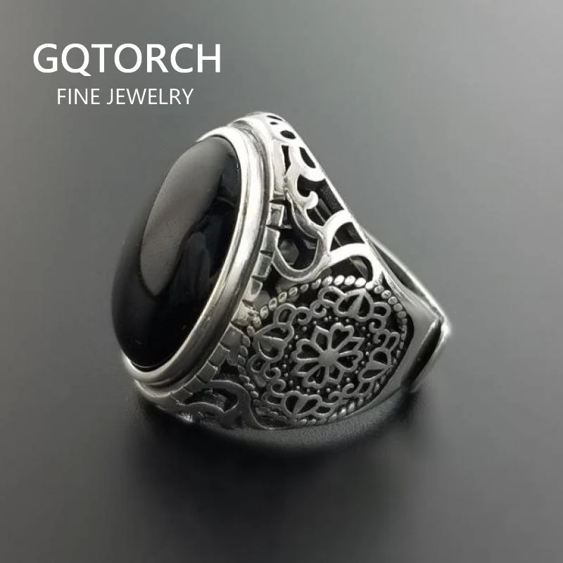 HIGH QUALITY Real Solid 925 Sterling Silver Black Ring Men Vintage Hollow Flowers Rings Open Natural Onyx Stone