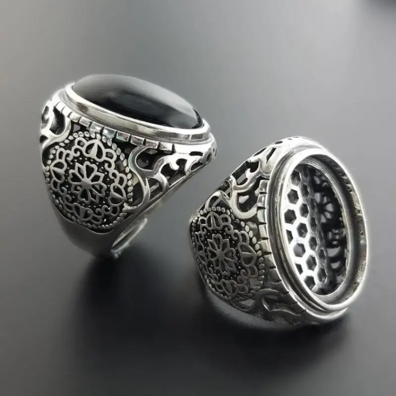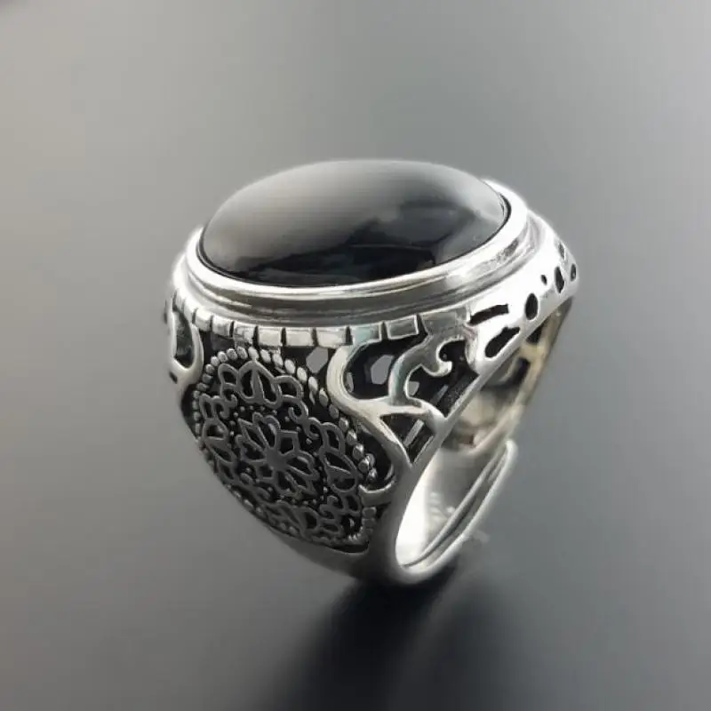 Best Seller Real Solid 925 Sterling Silver Black Ring Men Vintage Hollow Flowers Rings Open Natural Onyx Stone
