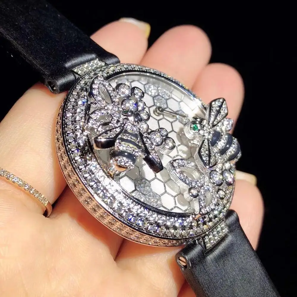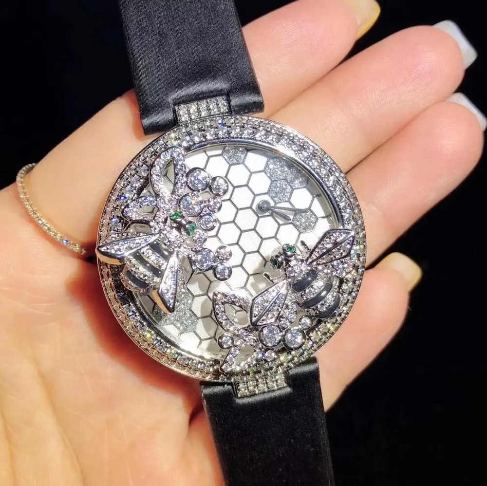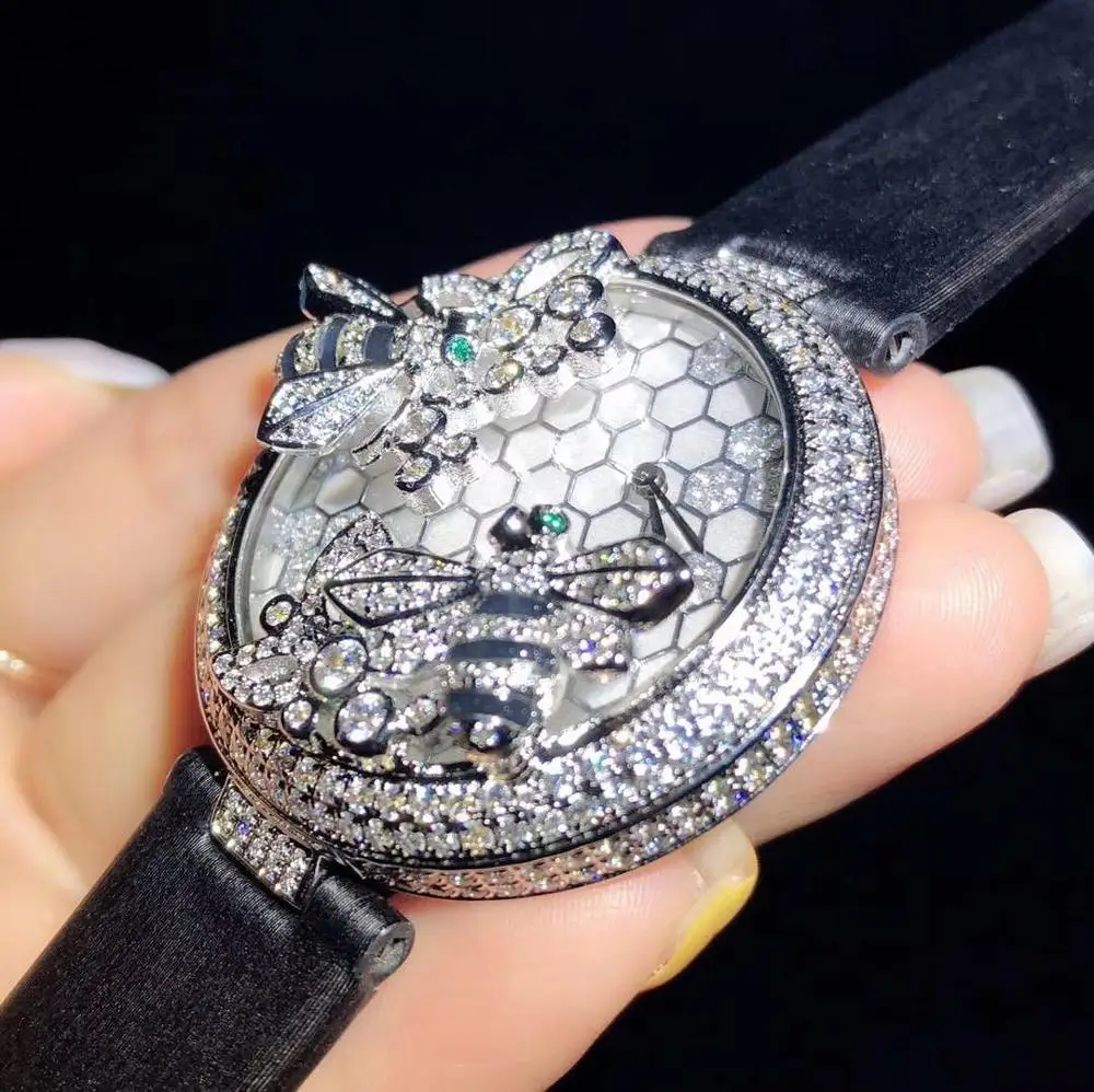 HOT Sale Luxury Top brand Handmade Leather strap zircon Stone double bee green eyes woman wristwatch round d